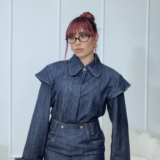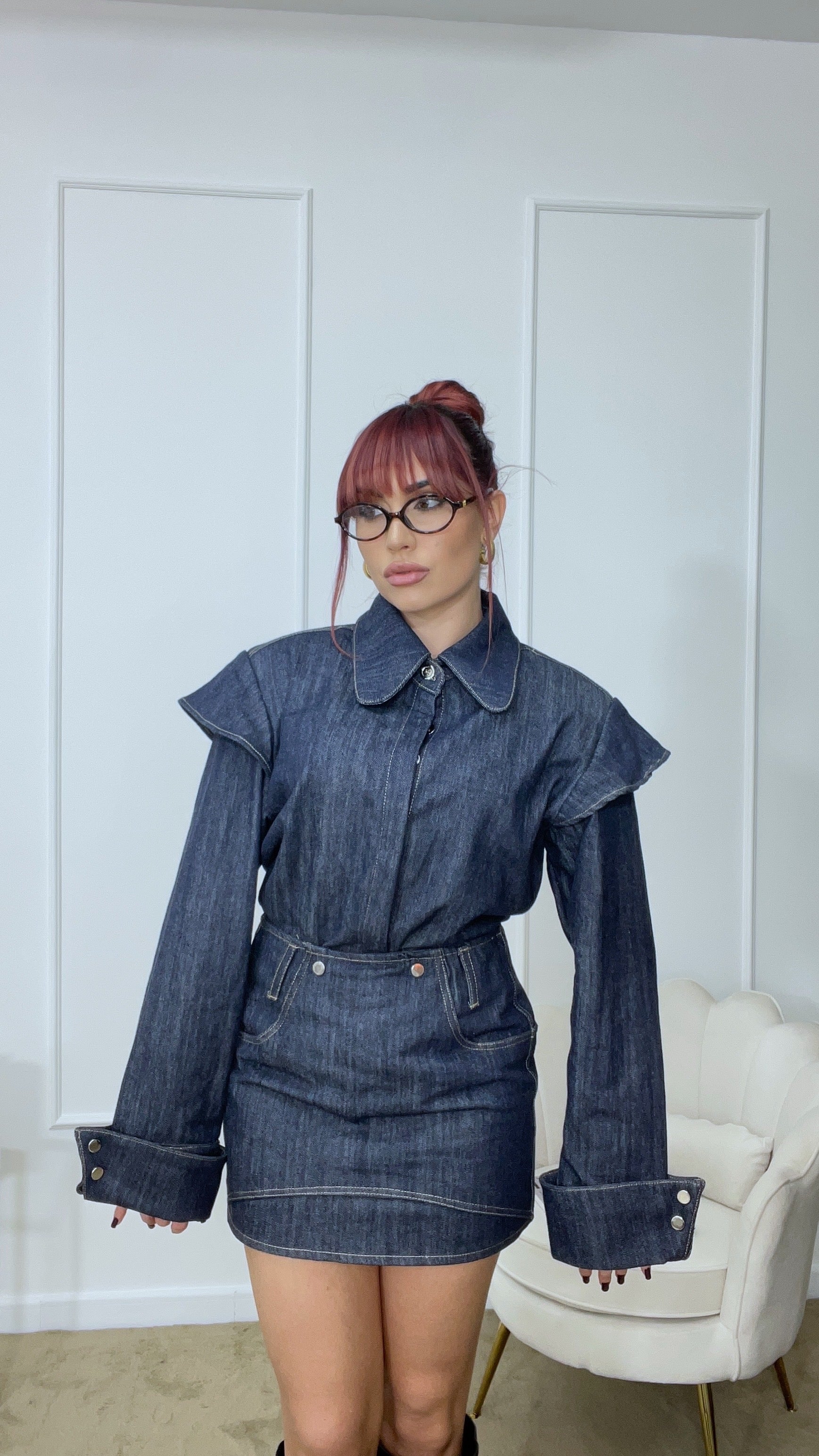 Coordinato in denim camicia e minigonna, modella indossa ML